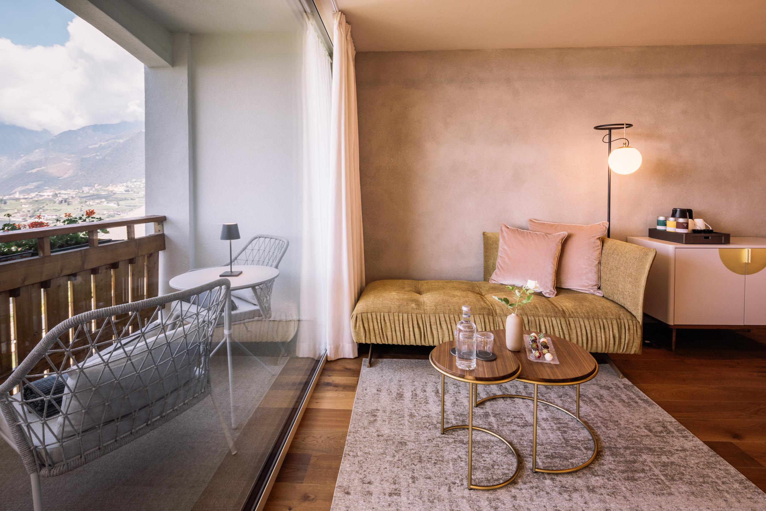 I mobili moderni dalle calme tonalità senape, i colori che richiamano la natura e il caldo pavimento di legno infondono benessere, piacevolezza e relax, così come il design dell’illuminazione curato fin nei minimi dettagli. Il fiore all’occhiello della camera è la vista mozzafiato sui maestosi monti che si possono ammirare anche dalla comodità del letto. Innovativi climatizzatori a soffitto assicurano temperature piacevoli durante tutto l’anno. I cani non sono ammessi.