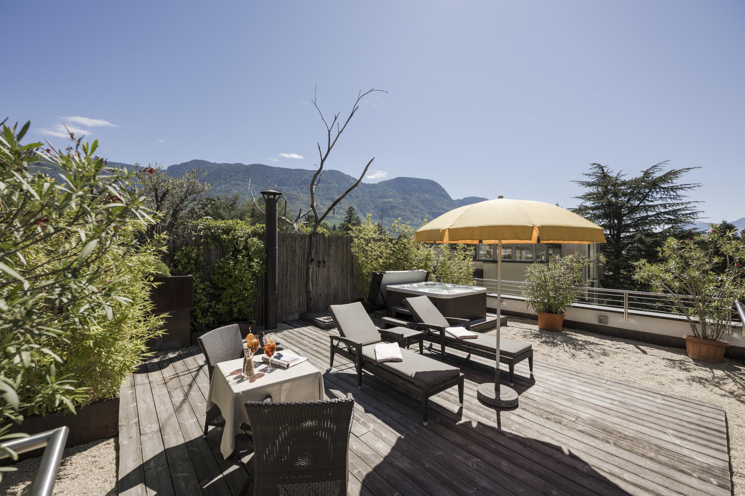 Ampia suite di lusso esclusiva, camera da letto con letto king-size in pelle pregiata con materasso memory foam| terrazza privata sul tetto con idromassaggio e vista 360° sui Monti di Merano | pavimento in parquet | ampio bagno con luce naturale | sauna a vapore | vasca idromassaggio | bidet | asciugacapelli | specchio per io trucco | esclusivi prodotti da bagno L'Occitane |soggiorno con divano in pelle e caminetto | 2 TV a schermo piatto | WIFI | telefono | radio | aria condizionata | cassaforte in camera |bollitore con selezione di tè | minibar | macchina Nespresso | zaino da trekking | mele altoatesine come regalo di benvenuto | fiori freschi del nostro giardino | dolcetti Loacker | praline pregiate