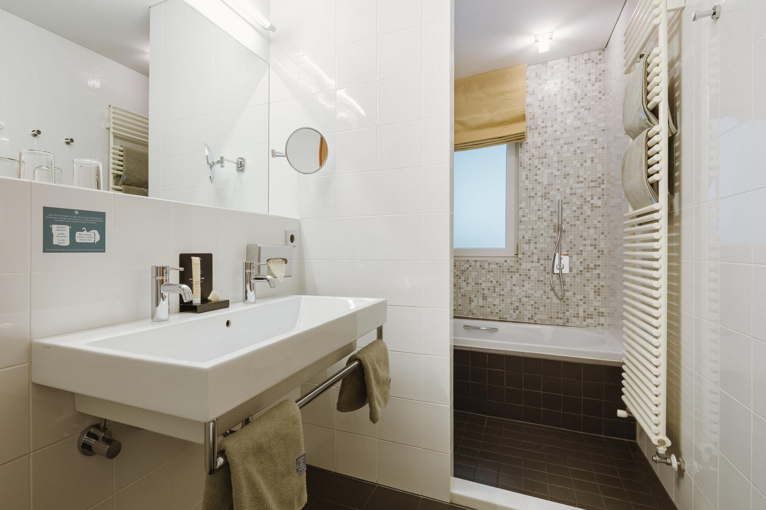 Camera Resia (27 m², 2 persone): Una camera moderna e accogliente, pavimento in legno, posto d’angolo a sedere, bagno con doccia, bidet, balcone ampio con vista nella Val Venosta, flat screen TV, Wi-Fi gratuito, minibar, cassaforte, parcheggio in garage