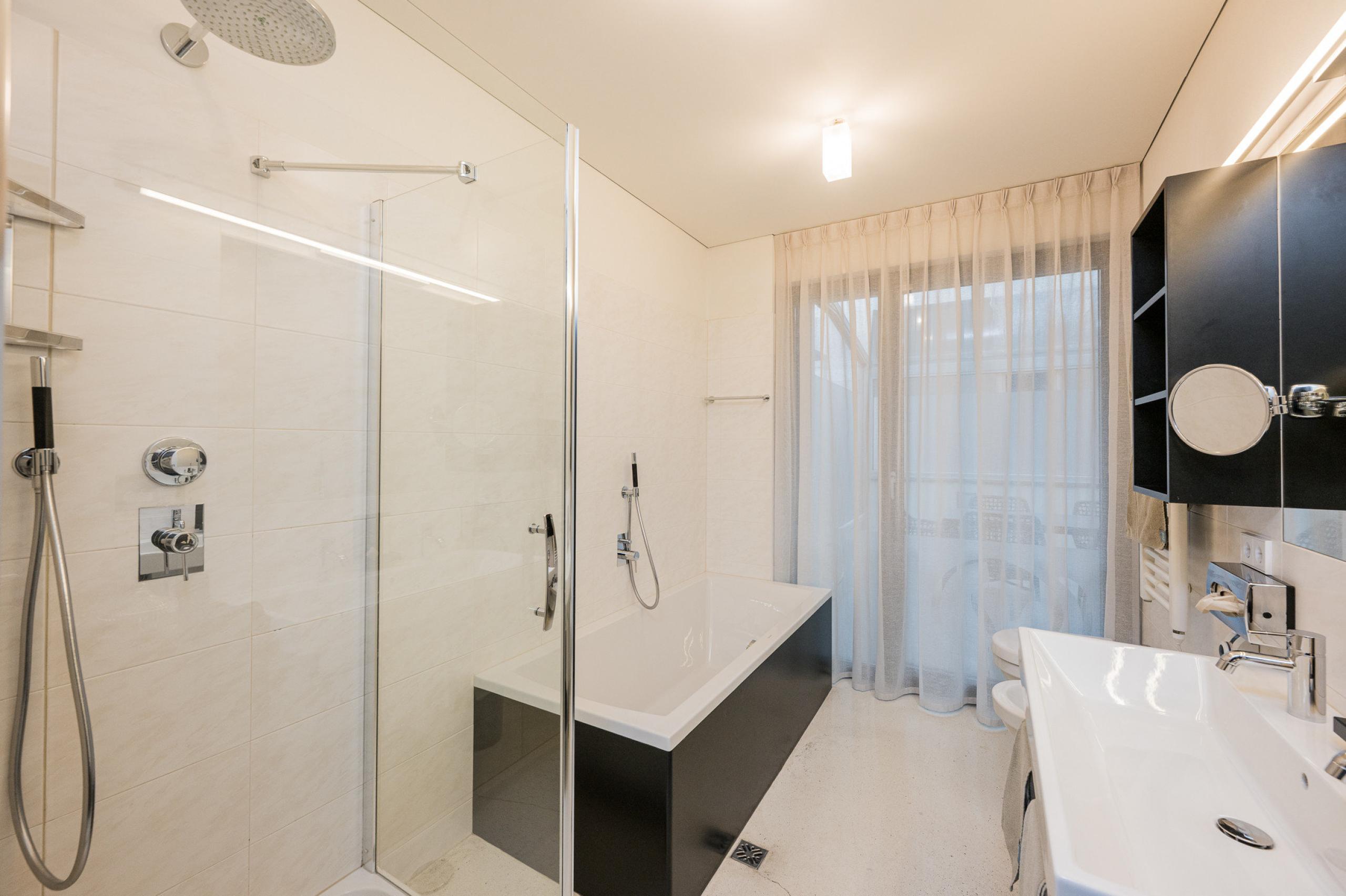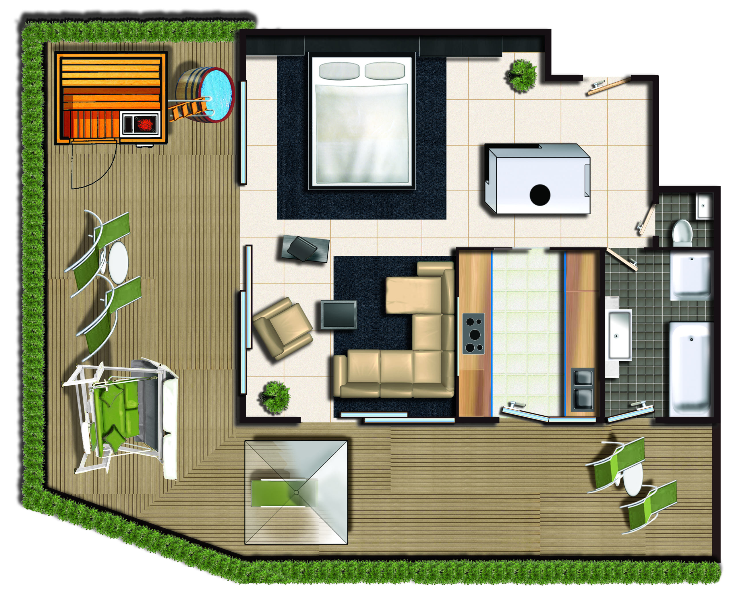 Suite Black & White (70 m², 2-4 persone): Suite di lusso nel 5° piano, zona notte e giorno ampia, lussuoso divano, poltrona da massaggio, stanza separata con due letti a castello per i bambini, pavimento in marmo, bagno con doccia e vasca da bagno, WC separato, flat screen TV, Wi-Fi gratuito, minibar, cassaforte, camino, terrazza a sud-est di 40 m² con bio-sauna, vasca esterna, lettino delle coccole, parcheggio in garage