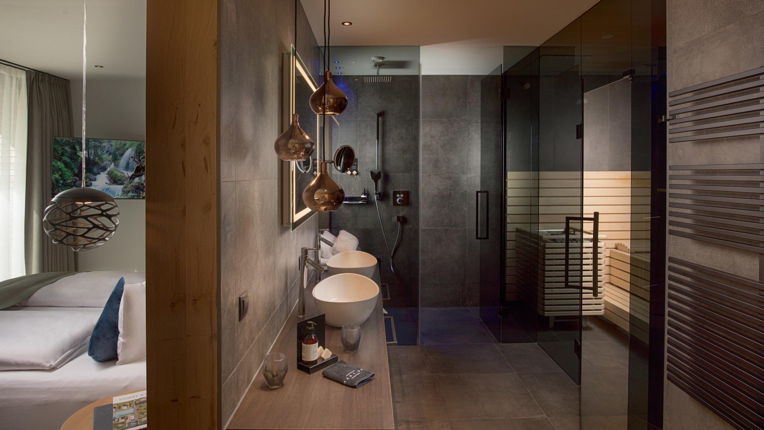 • spazioso bagno aperto con doccia tropicale e sauna finlandese