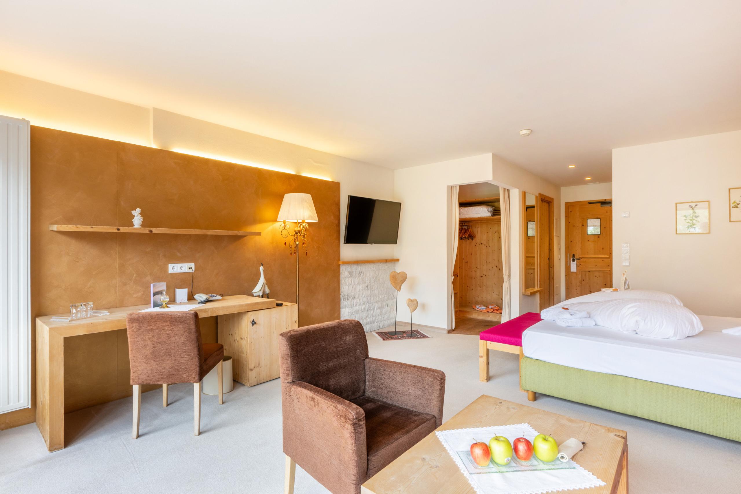 Tutte le stanze direzione giardino sono arredate diversamente. Questa luminosa stanza fatta in legno chiaro di cirmolo, offre un bagno con doccia, WC separato con bidet, zona soggiorno con TV LCD, accesso internet e balcone verso sud e giardino con vista incantevole dolomitica.