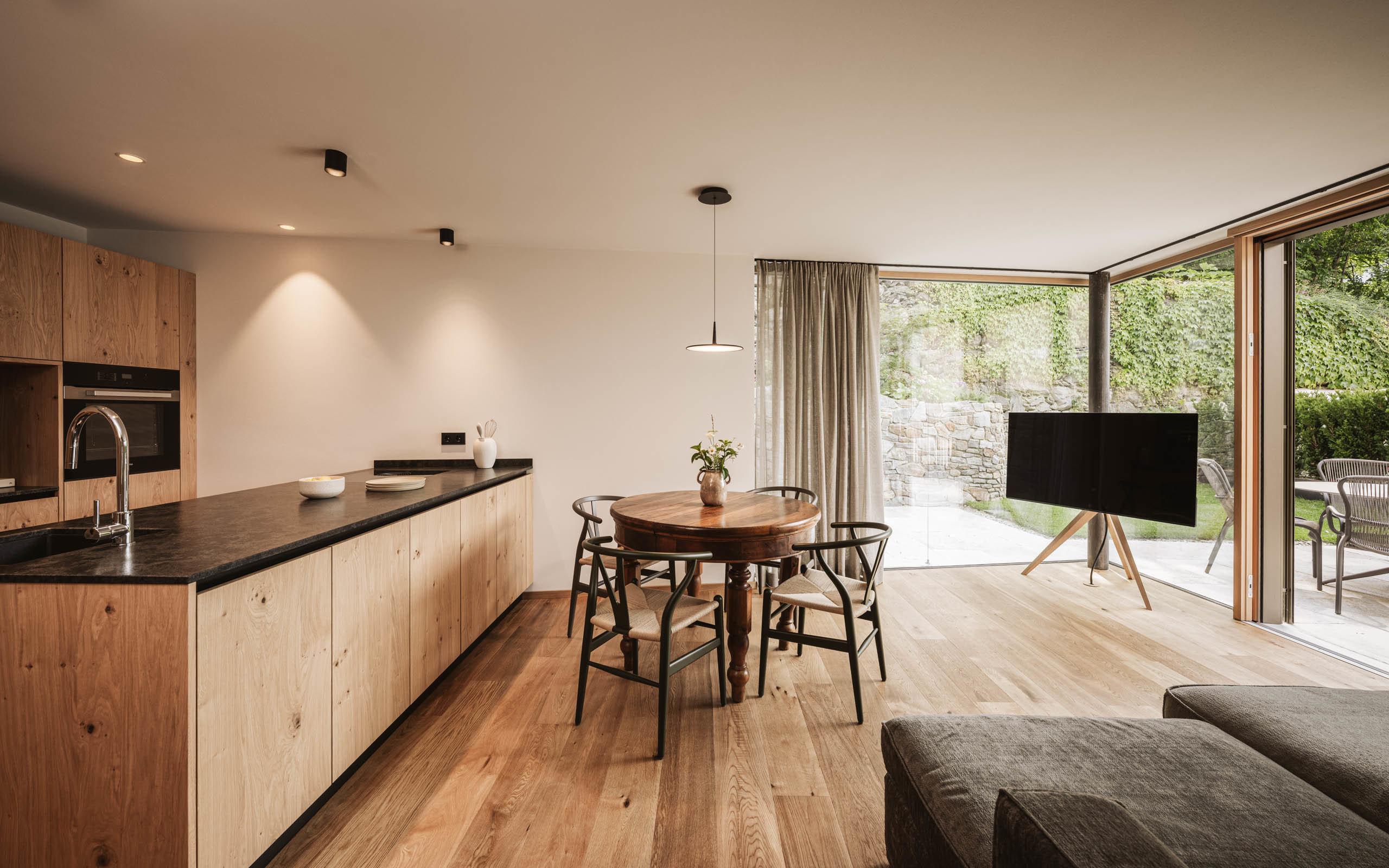 Due camere da letto, l’ampio soggiorno e il giardino privato di 30 m² è un appartamento da sogno per le vacanze a Bressanone per un’intera famiglia o un gruppo di amici fino a cinque persone. I due lussuosi bagni in marmo Vi attendono per una meravigliosa doccia calda dopo un’avventura nelle Dolomiti, un viaggio gastronomico o una giornata di shopping nel centro storico di Bressanone. La cucina di alta qualità con isola di cottura e accesso diretto al giardino privato è il punto d’incontro perfetto per serate culinarie accompagnate da un ottimo Kerner della cantina del vicino monastero di Novacella.