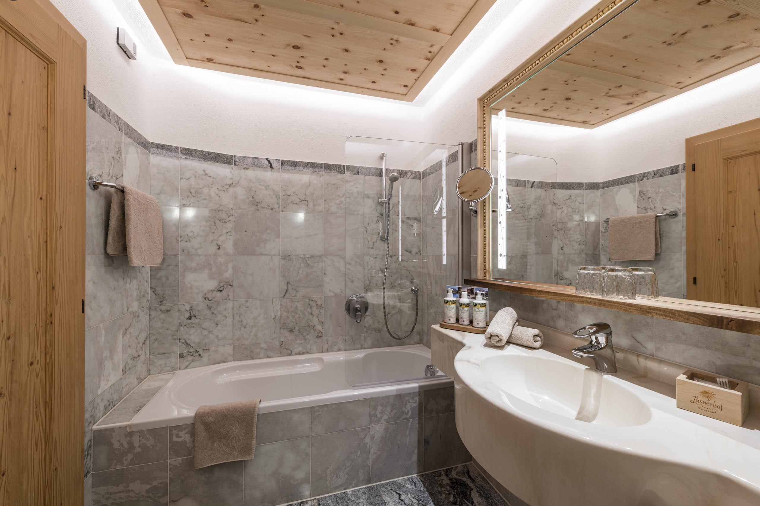 La Suite Arnika offre 40 m² di comfort ed è ideale per due o tre persone. Il soggiorno, con una decorativa stufa da fattoria, crea un’atmosfera accogliente. I mobili e il pavimento sono realizzati in legno massiccio non trattato delle foreste locali, conferendo alla suite un carattere autentico e caldo. Il bagno in marmo elegante è dotato di vasca/doccia. Dal balcone soleggiato esposto a sud si gode di una vista mozzafiato sulla valle.