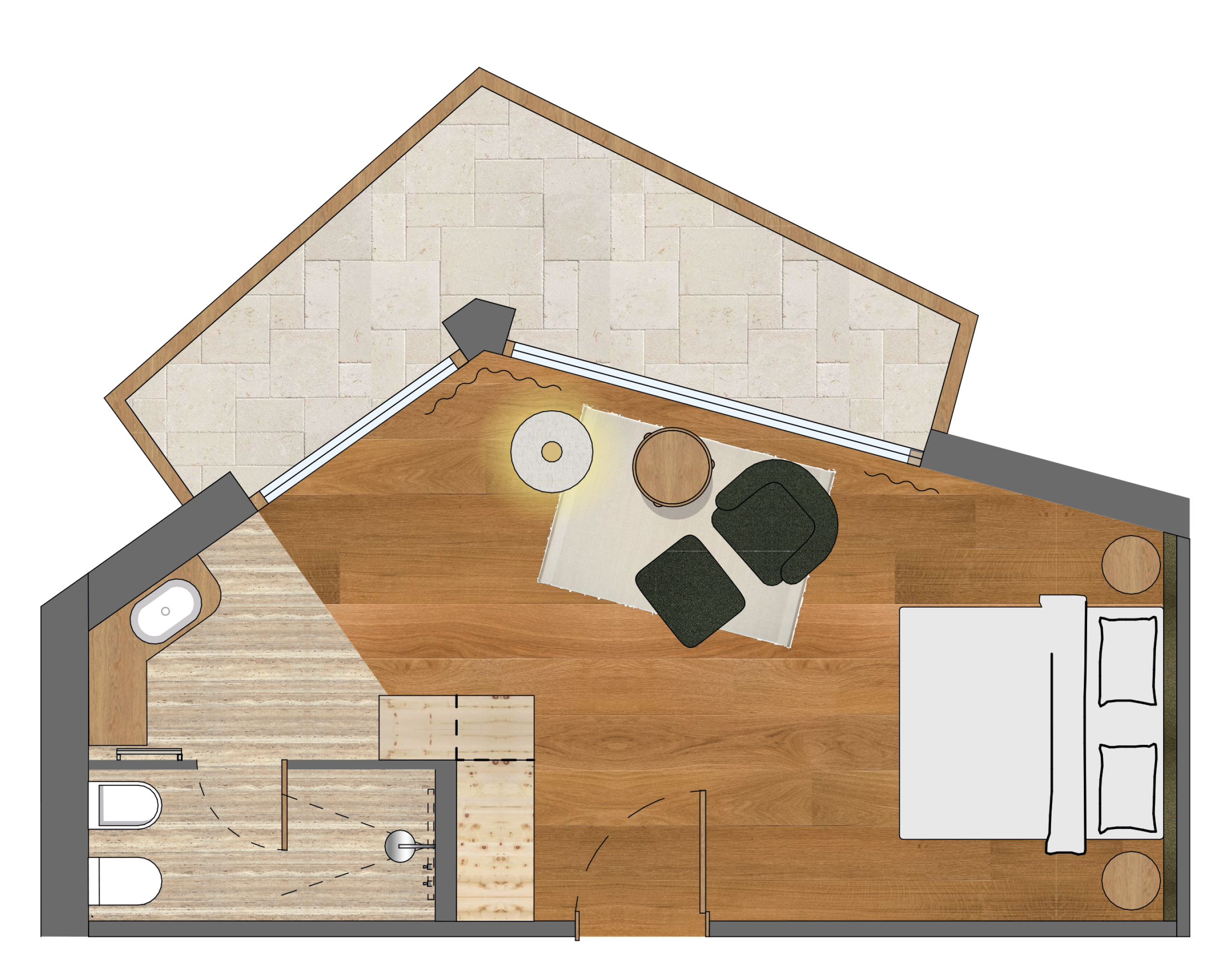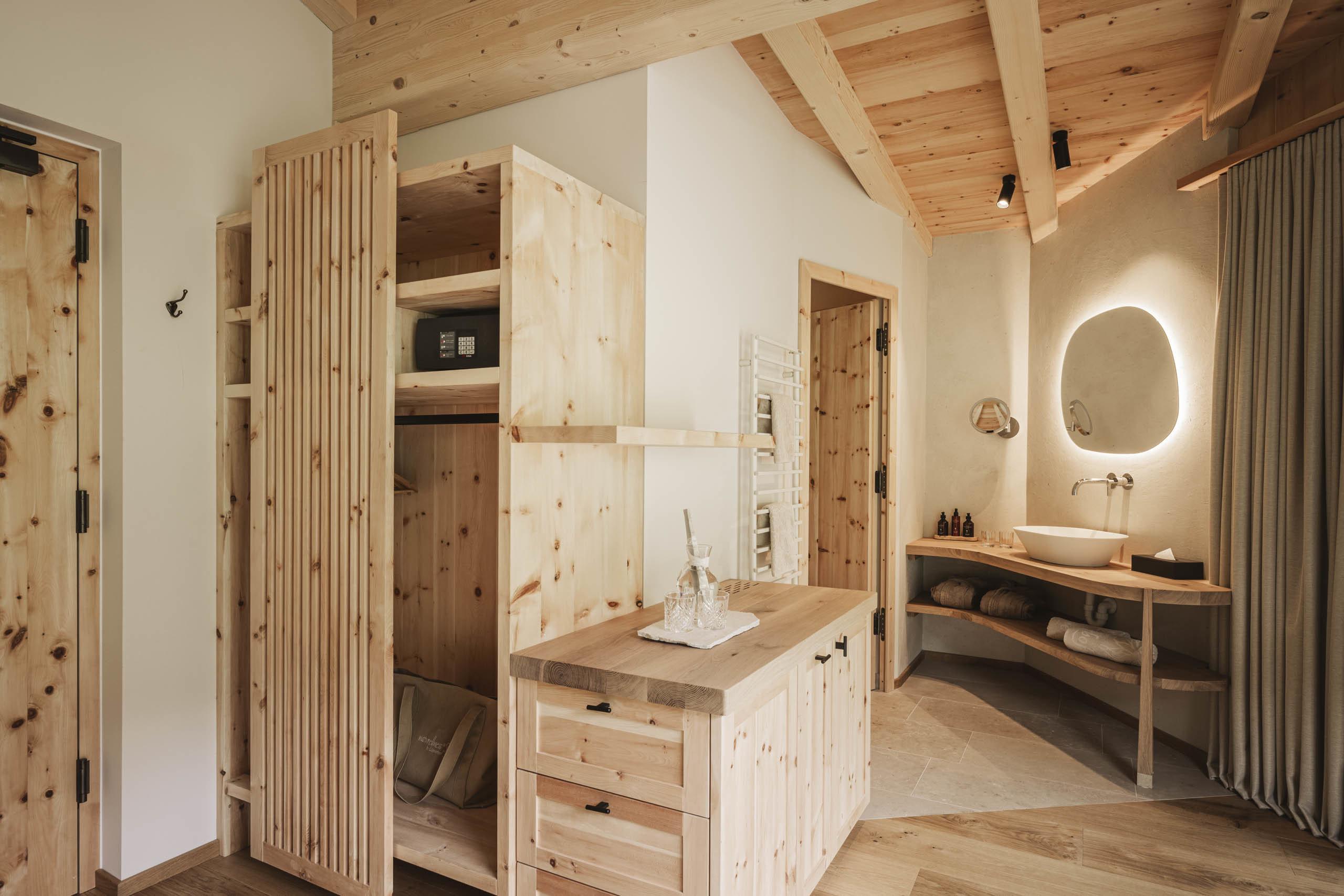 La Suite Foresta, completata a giugno 2024, offre un rifugio particolarmente tranquillo con una vista idilliaca sul bosco. Grandi finestre panoramiche inondano la stanza di luce naturale e offrono una vista mozzafiato sulla natura. L’arredamento accogliente ed elegante, realizzato secondo i principi della bio architettura del Lüsnerhof, crea un’atmosfera speciale donando un senso avvolgente di calore che invita a fermarsi e ritrovare equilibrio nella propria vita. Una camera accogliente di classe superiore. Con TV smart.