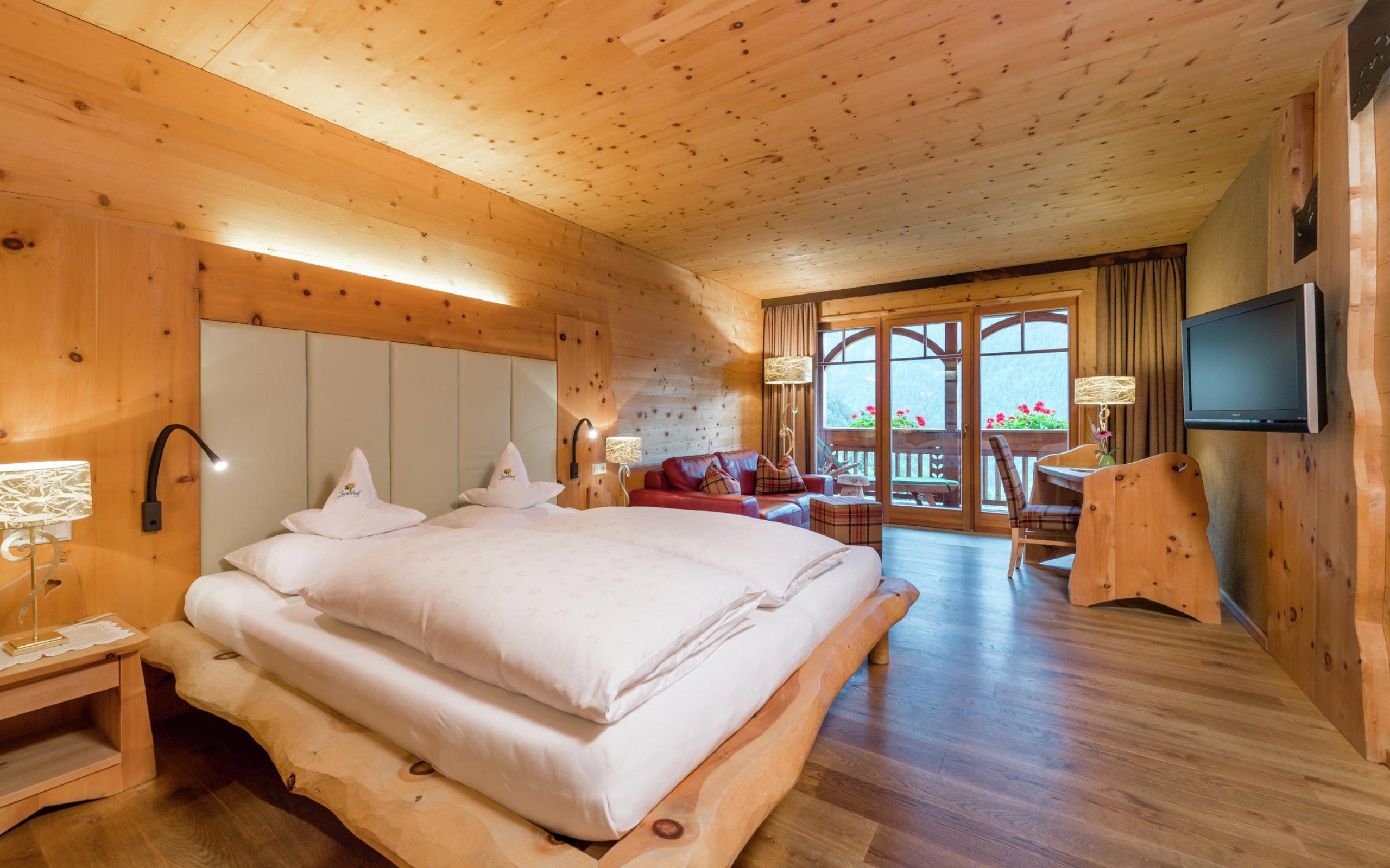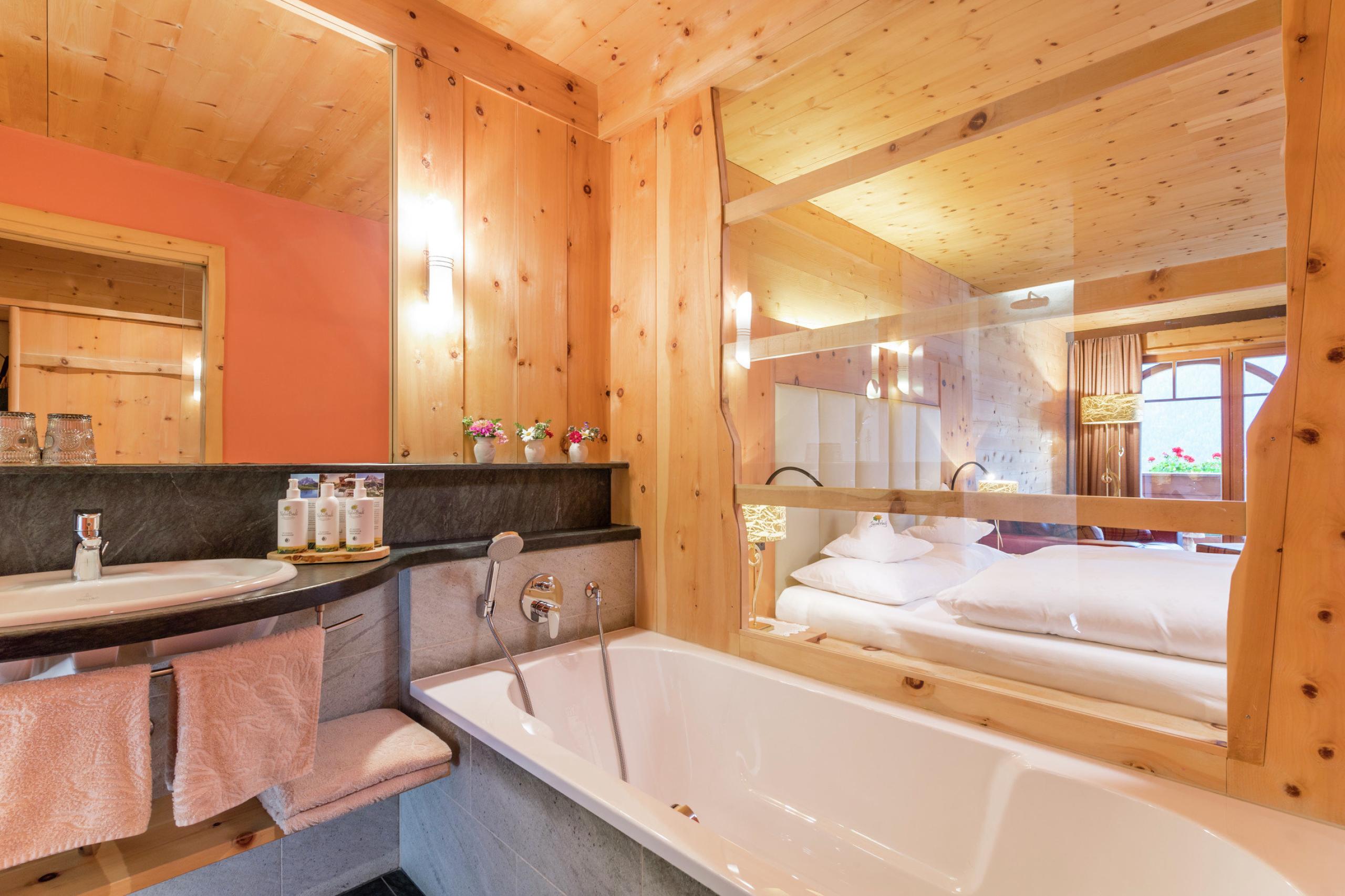 Circondata dall’elegante legno di cirmolo, la suite cirmolo che non solo incanta con la sua bellezza naturale, ma garantisce anche un sonno particolarmente rigenerante, offre un’atmosfera spaziosa e raffinata. L’area del bagno in marmo, con vasca da bagno e doccia, invita a momenti di tranquillità senza interruzioni. Dal balcone esposto a sud si gode di una vista mozzafiato sulla valle – il luogo perfetto per concludere la giornata sereno.