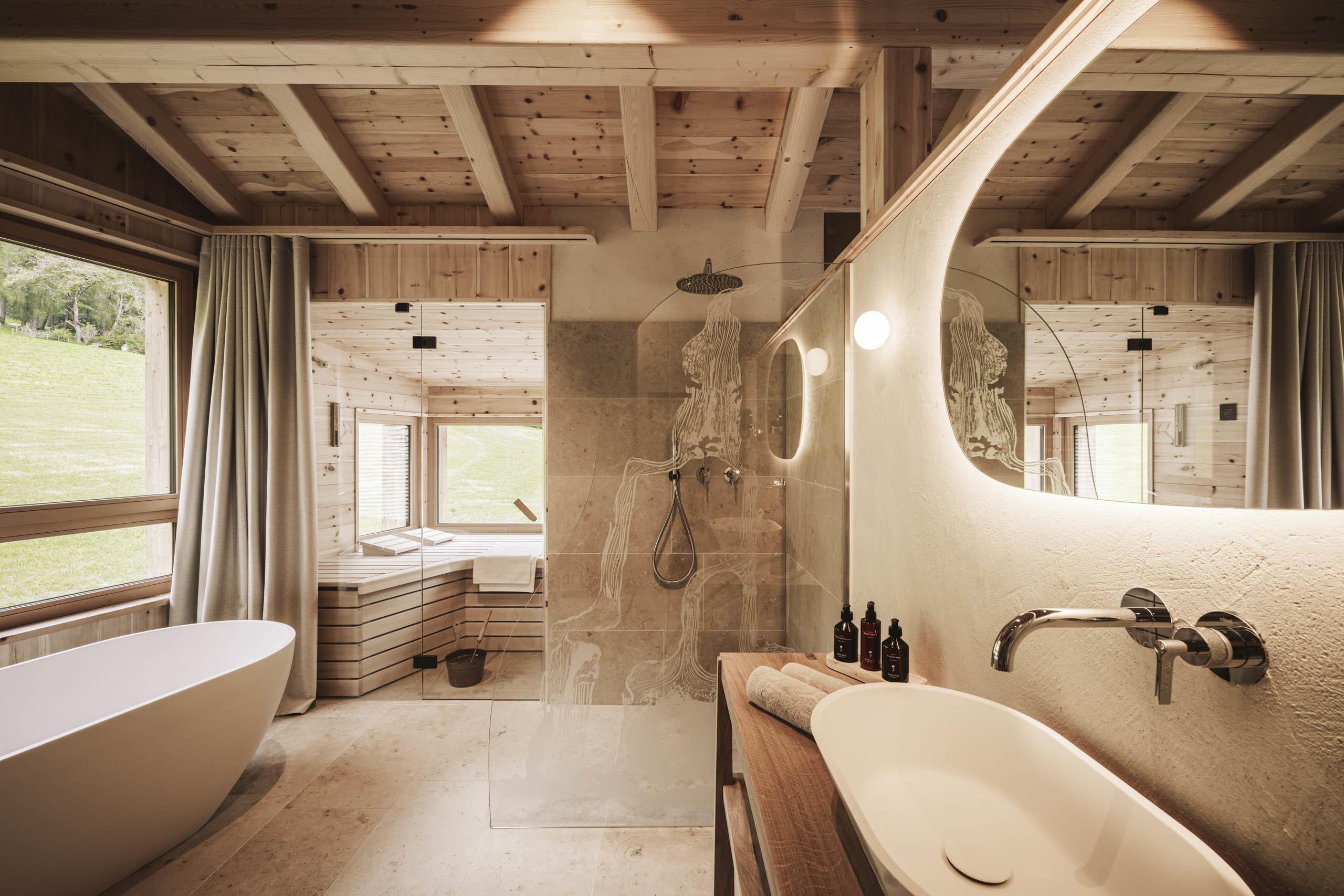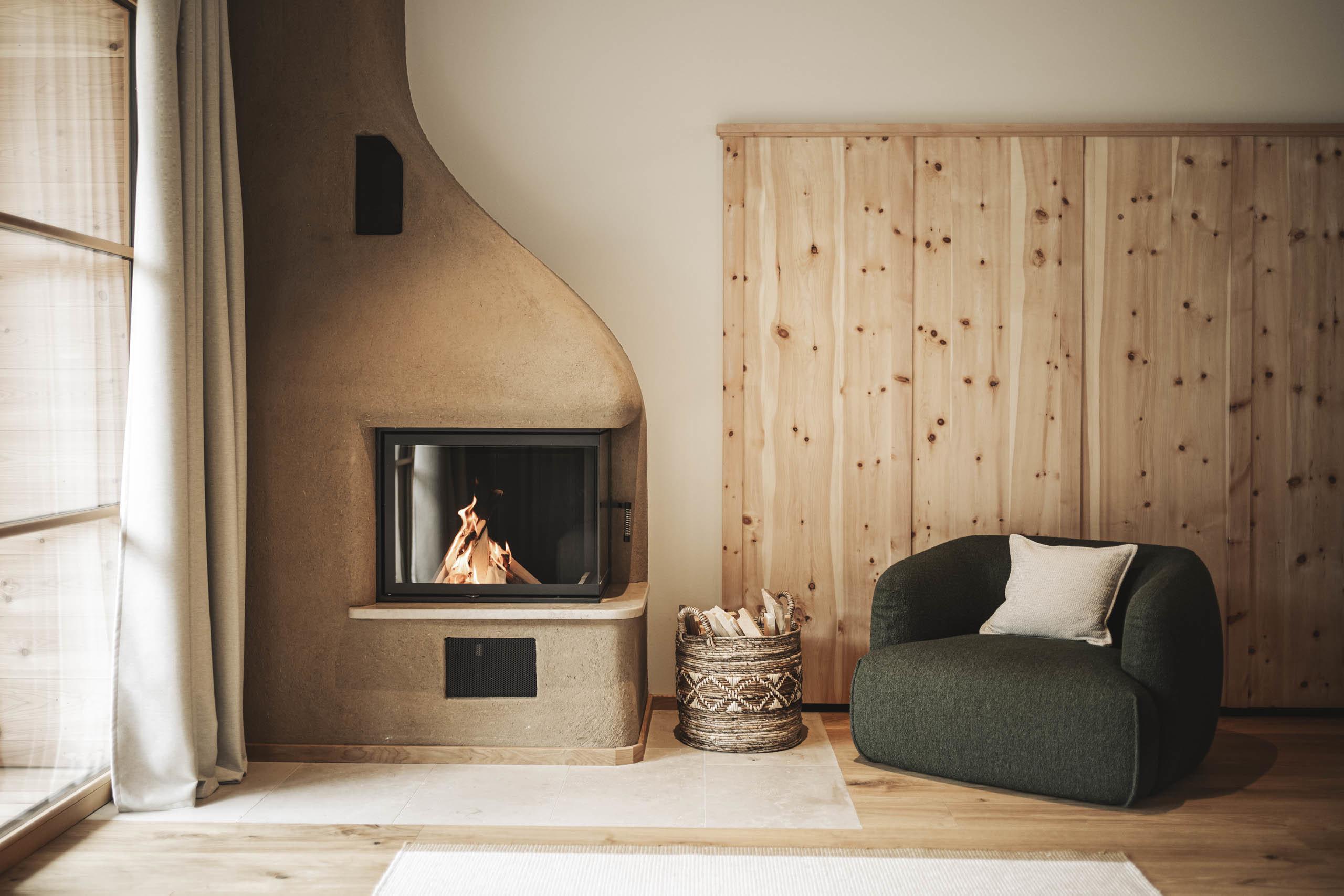 La suite wellness (completata in giugno 2024) nel nuovo padiglione combina il comfort di lusso con un’esperienza SPA esclusiva. La suite si distingue per il suo elegante camino e la sauna privata, che offrono calore e momenti di profondo relax. La vasca da bagno freestanding accanto alla finestra invita ad un bagno rilassante con vista sul verde esterno del prato e del bosco. La loggia riparata dal vento è un luogo di piacevole ritiro per trascorrere del tempo all’aperto nella privacy della vostra camera. Pareti in intonaco di argilla, legno di pino cembro della nostra foresta, marmo e materiali naturali di alta qualità creano un ambiente di naturale eleganza. Con Smart TV.