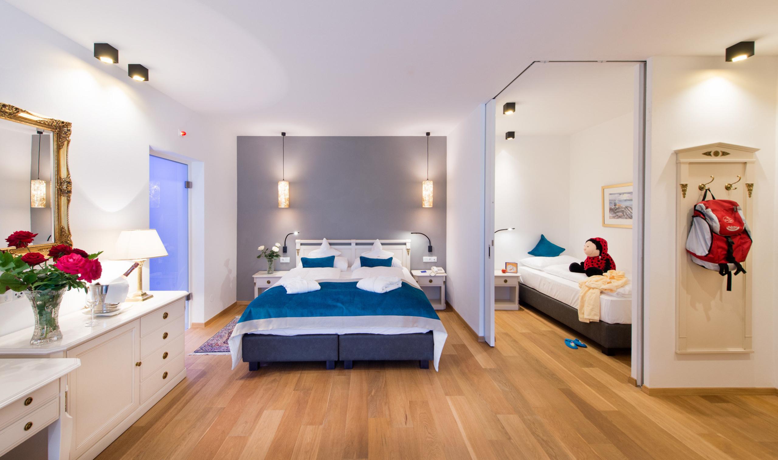La stilosa Junior Room Superior del 1° piano con vista laterale sul lago e terrazza coperta di 7m2 offre molto spazio a tutta la famiglia. Zona giorno e zona notte per i genitori e letto aggiuntivo separato per il vostro bambino.