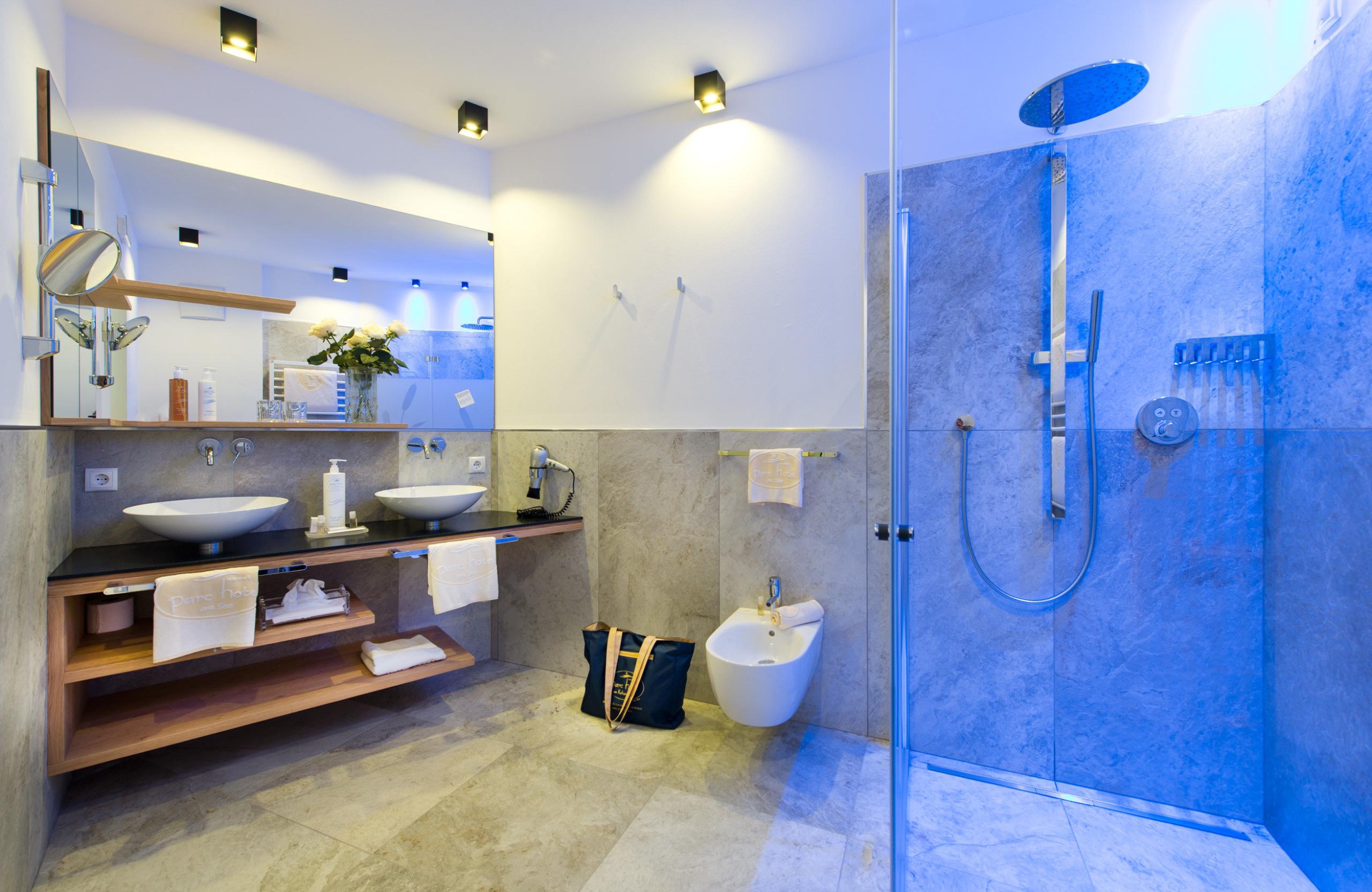Arredamento: pavimento in parquet, 7 m² di terrazza con vista sul lago laterale, aria condizionata, TV, zaino da trekking, camera da letto con zona giorno, lettino per bambini separato, bagno con doccia, WC e bidet, pregiati prodotti per la cura del corpo, asciugacapelli, borsa wellness con accappatoio morbido e asciugamani, WLAN gratis, minibar, cassetta di sicurezza.