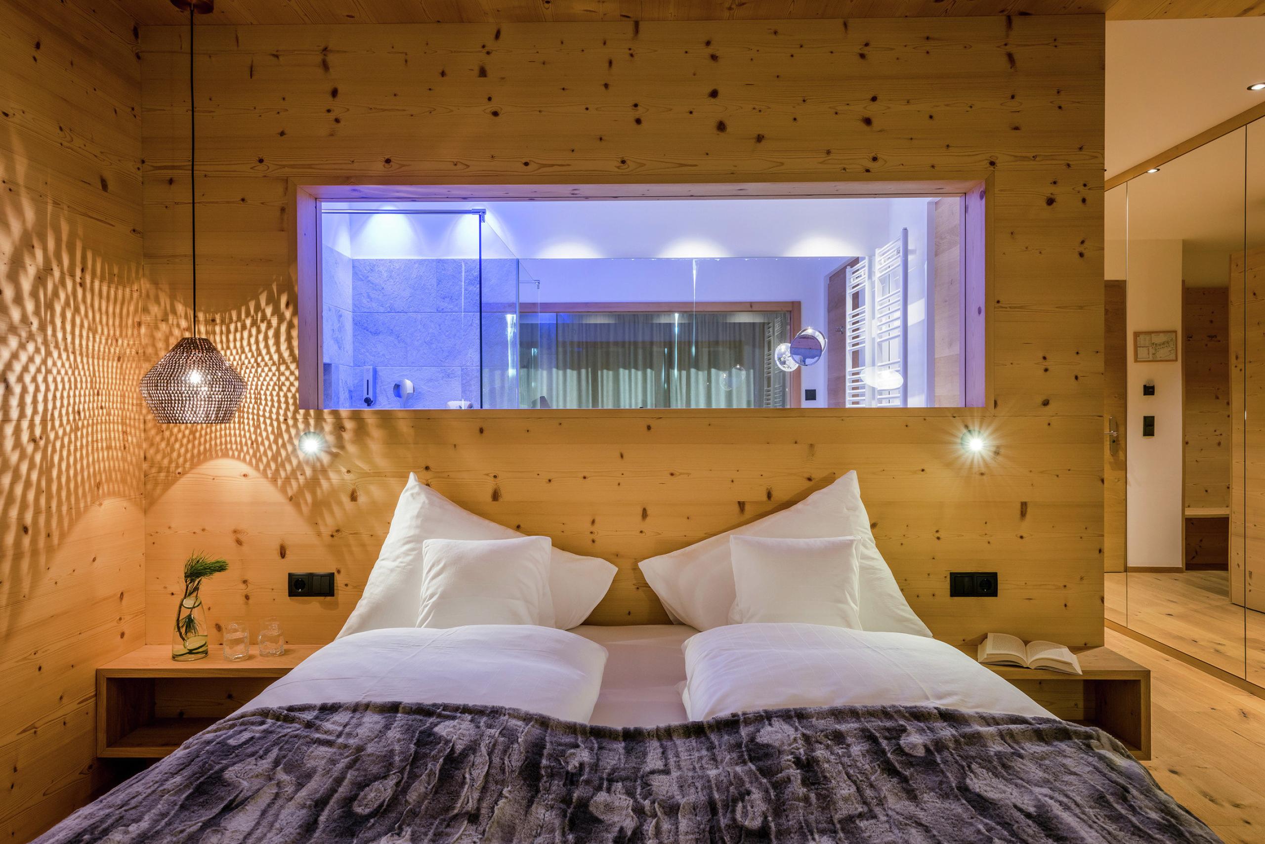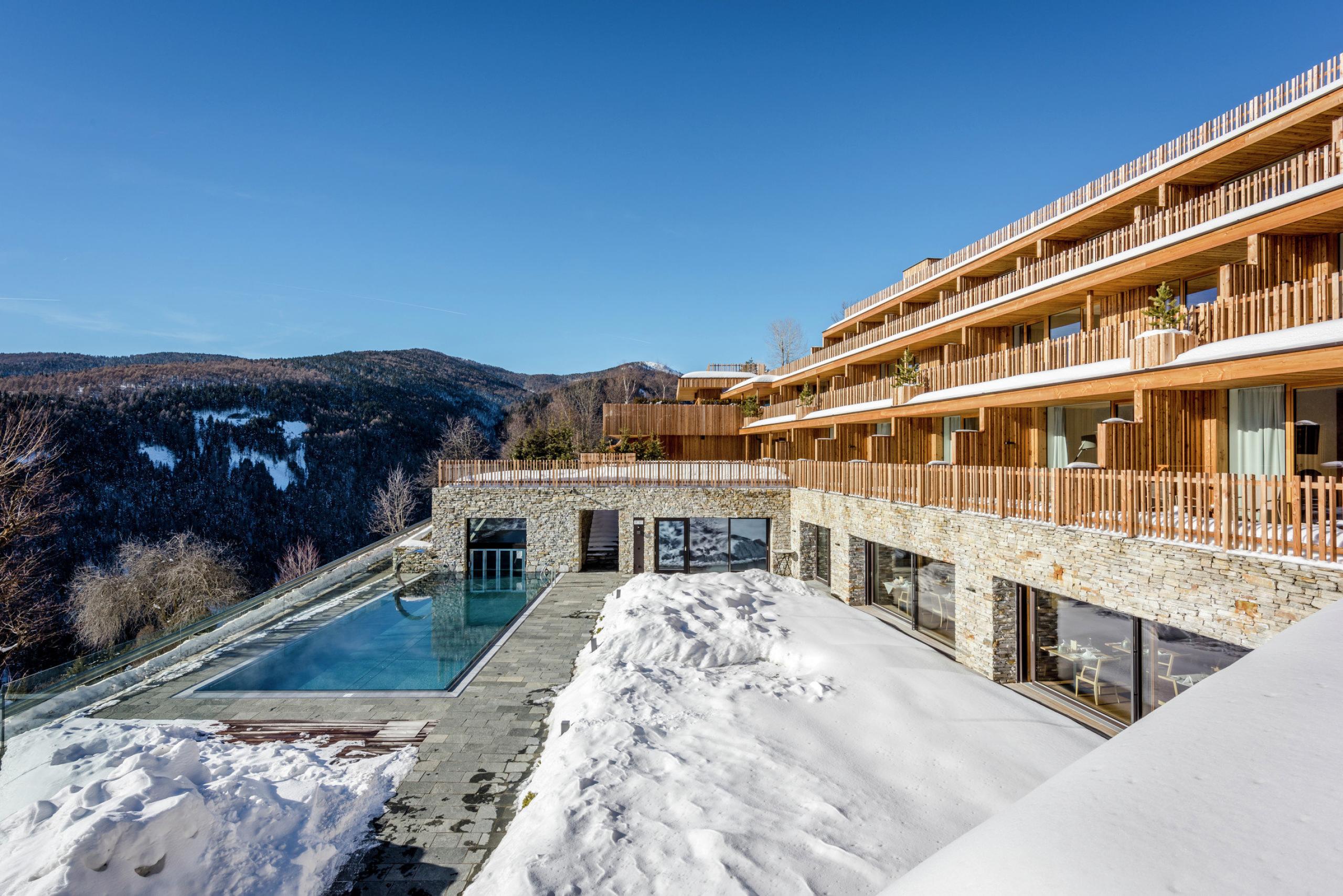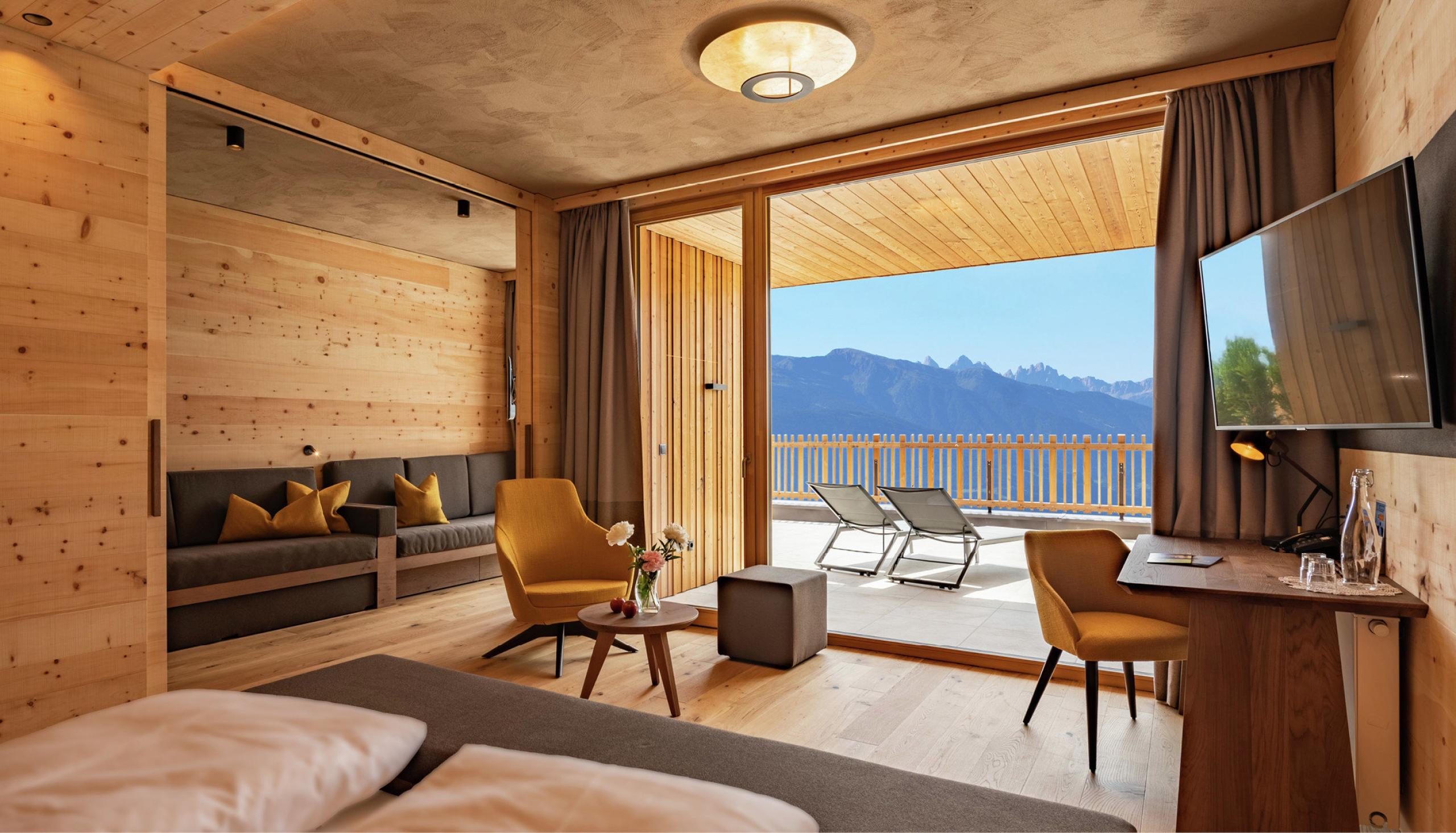 La particolare struttura architettonica a terrazzamenti del Tratterhof regala una sensazione di spazio e libertà senza fine, mentre le accoglienti Luxury Suite assicurano privacy, intimità e una vista ad ampio respiro.