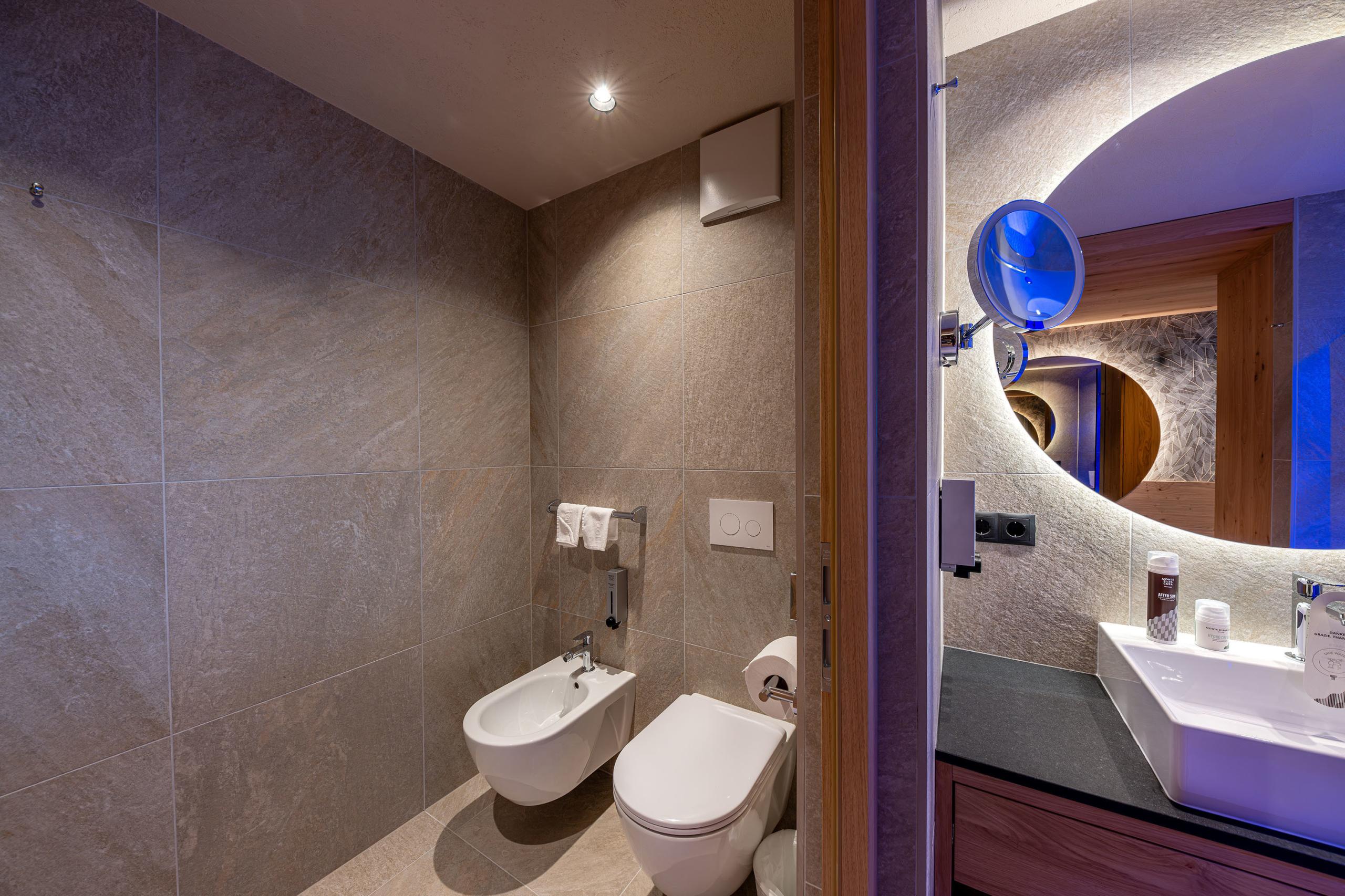 Junior Suite con balcone esposto a sud e vista panoramica sulle Dolomiti, arredata con materiali naturali e pavimento in legno naturale. Divano, doccia, WC separato e bidet.