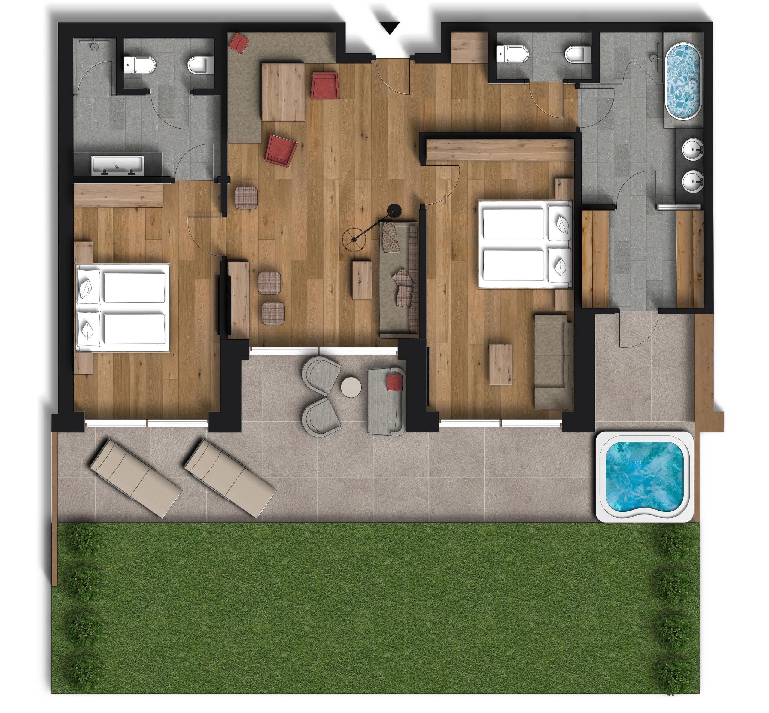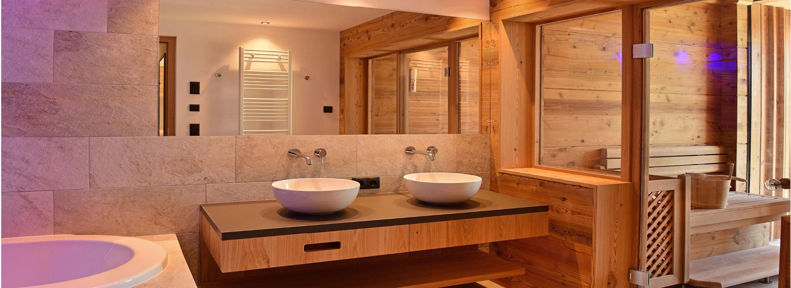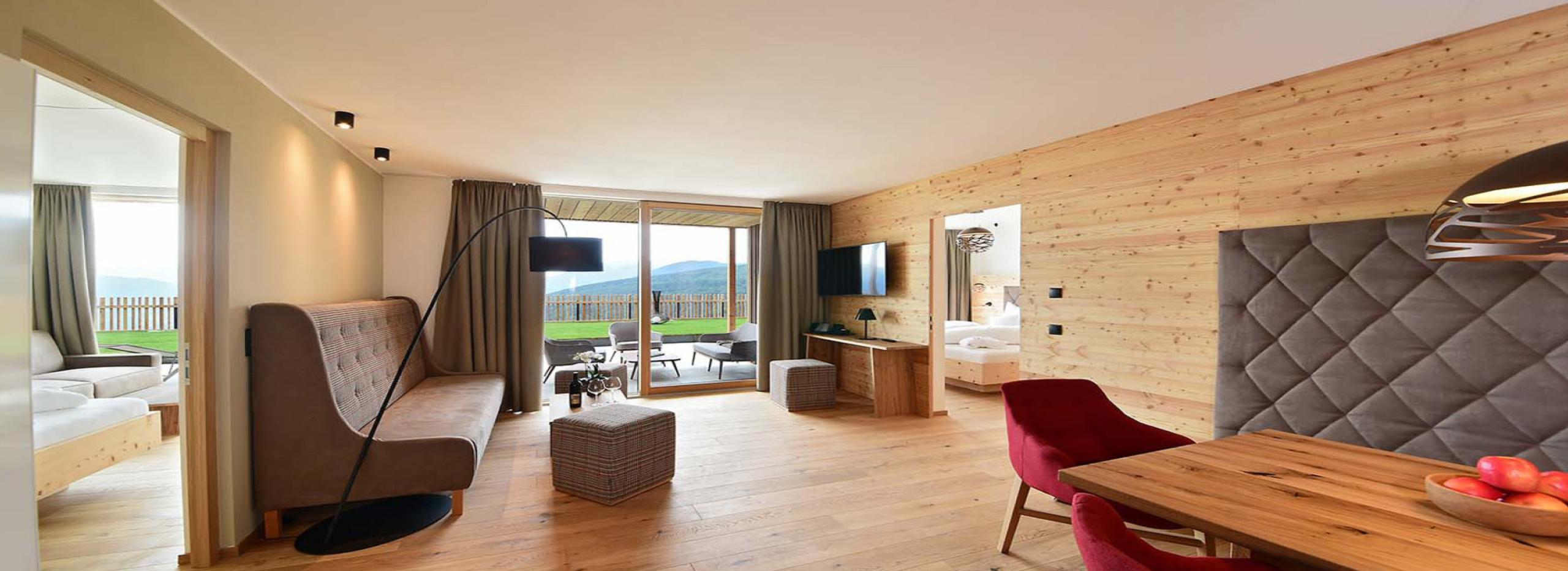 Chalet esclusivo con ampia terrazza esposta a sud, sauna finlandese privata, vasca idromassaggio e vista sulle Dolomiti. Materiali naturali, pavimento in legno naturale. Due camere da letto separate con letti matrimoniali extra lunghi e bagno privato ciascuna (doccia, doppio lavabo, uno con vasca idromassaggio). Soggiorno con ampia zona salotto e divano angolare.