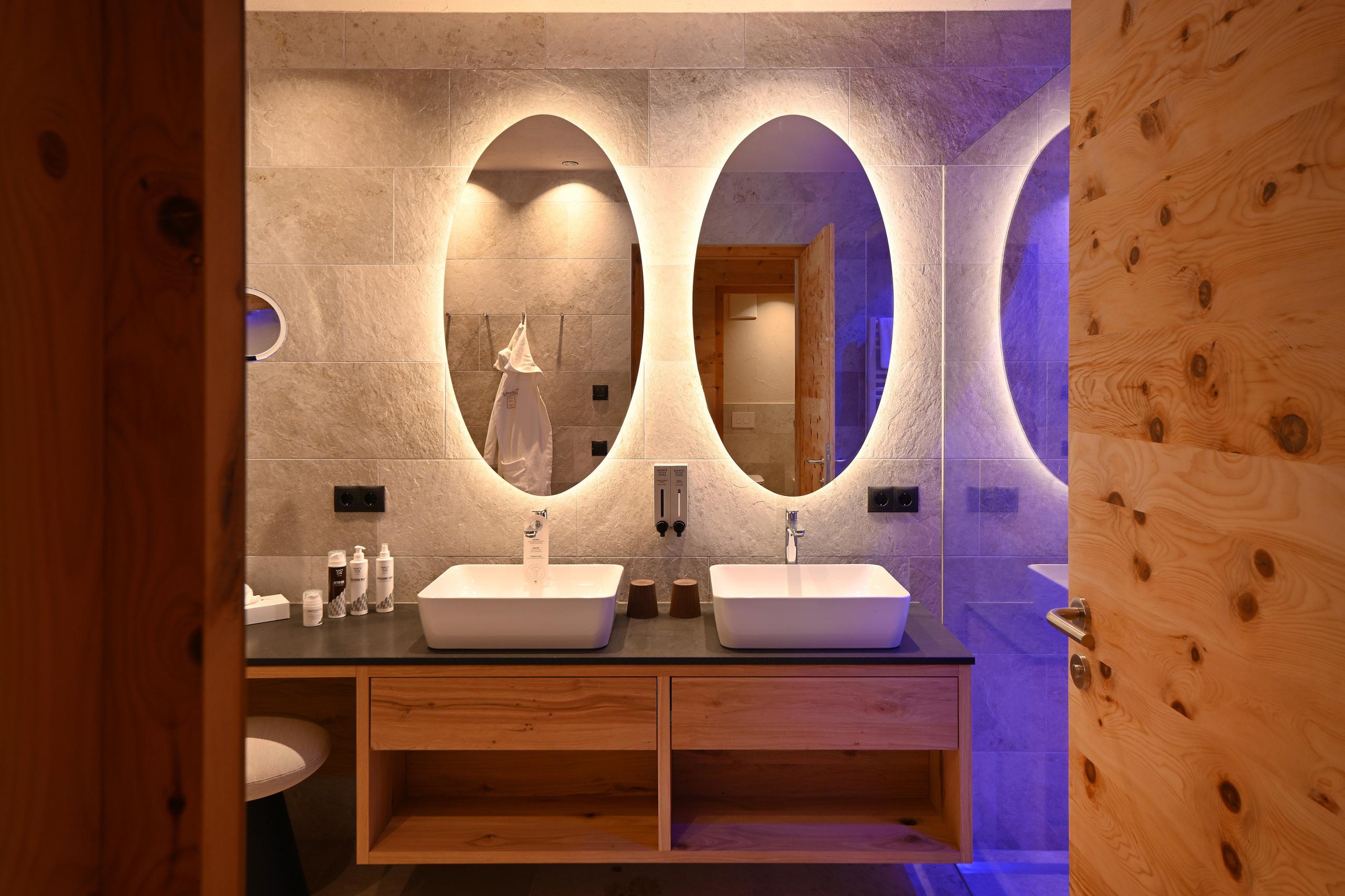 Ampia suite con terrazza esposta a sud, idromassaggio e vista panoramica sulle Dolomiti. Materiali naturali, pavimento in legno naturale.