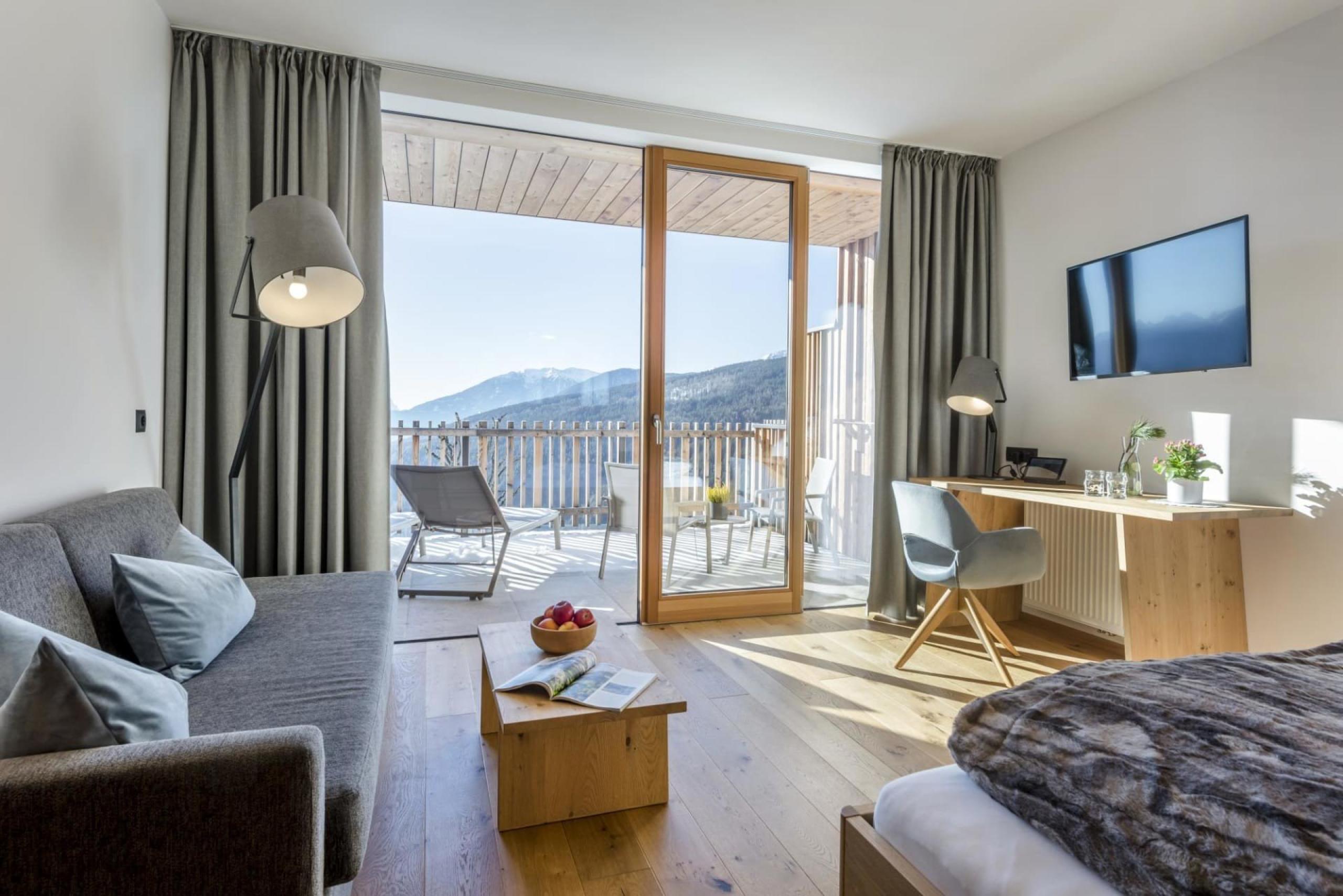 Junior suite esclusiva con ampia terrazza esposta a sud, lettini relax e vista panoramica sulle Dolomiti. Materiali naturali, pavimento in legno naturale. Letto matrimoniale, soggiorno con divano. Bagno moderno con doppio lavabo, grande doccia e luce naturale; WC e bidet separati.