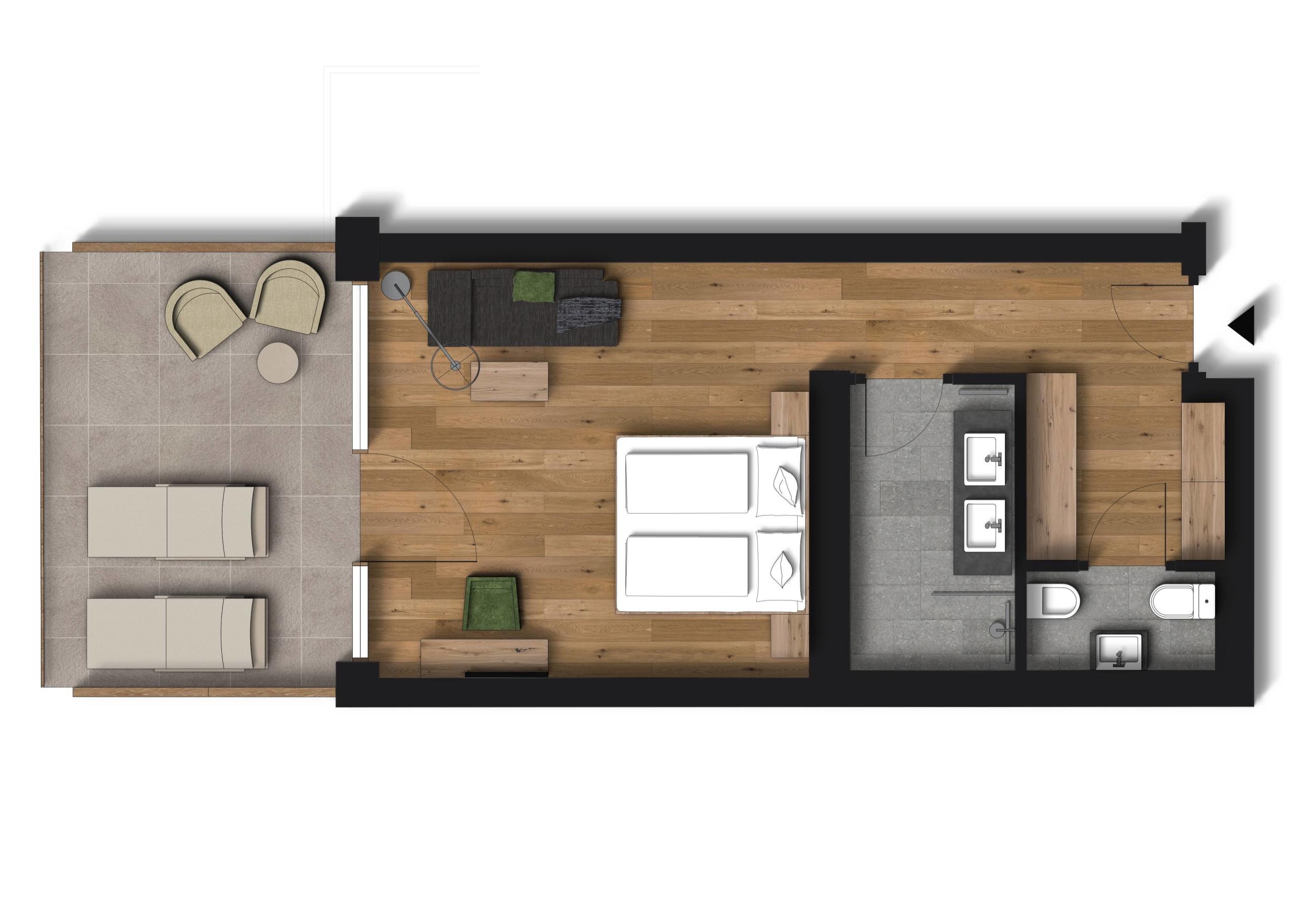 Elegante junior suite con ampia terrazza esposta a sud, lettini relax e vista sulle Dolomiti. Materiali naturali, pavimento in legno naturale. Letto matrimoniale, soggiorno con divano. Bagno moderno con doppio lavabo, doccia e luce naturale, WC e bidet separati.